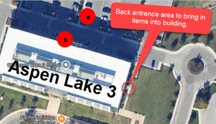 Parking Information: Park in the lot marked 'a'. Do not unpack if you are bringing materials. Just bring your ID to the door and ring the doorbell. Security will check you in and give you a guest badge. After checked in, you can unload your car. When you are ready to bring in your pup, Stacy can open the back entrance door for you. Stacy will escort you to the room. A Q2'er must always be with you when inside the building.